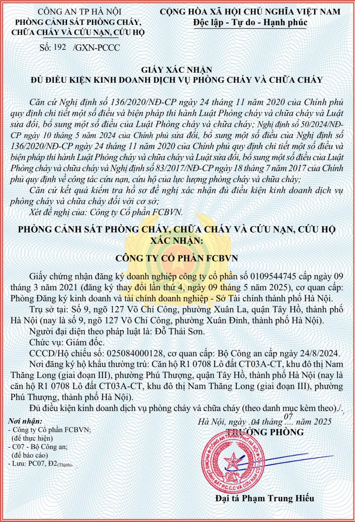 Công ty cổ phần FCBVN là một trong những đơn vị hàng đầu trong lĩnh vực tư vấn, thiết kế, thẩm duyệt, thi công và lắp đặt hệ thống phòng cháy chữa cháy (PCCC) chuyên nghiệp tại Việt Nam. Với nhiều năm kinh nghiệm, chúng tôi tự hào là đối tác tin cậy, mang đến các giải pháp PCCC toàn diện, hiệu quả, đảm bảo an toàn tuyệt đối cho mọi công trình.